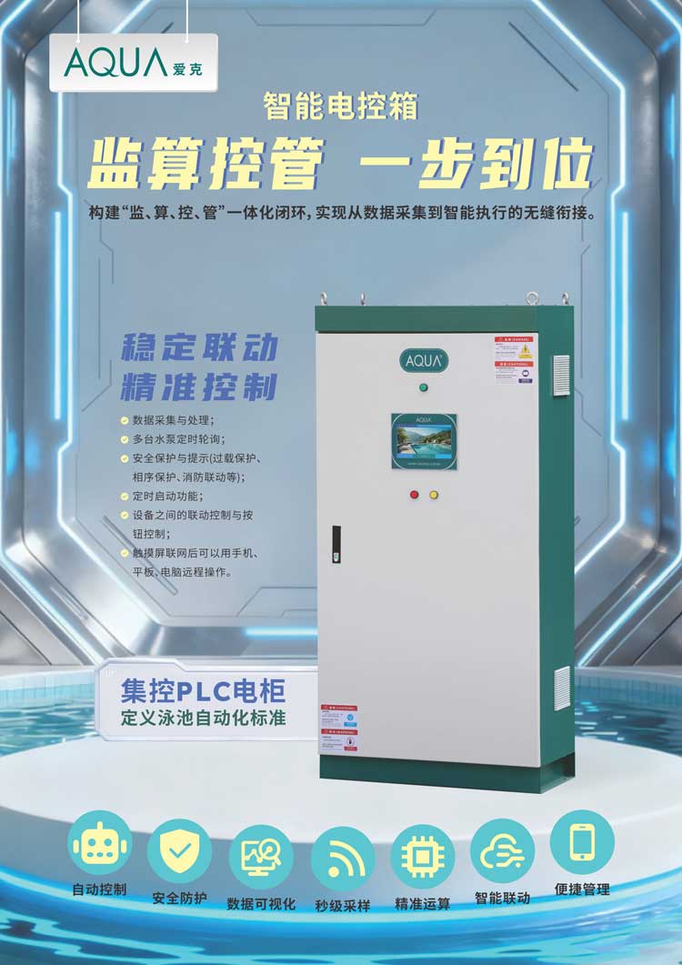 AQUA愛克泳池集控 PLC 電柜集“監(jiān)、算、控、管” 四層架構(gòu),傳感器秒級采集水溫、余氯等數(shù)據(jù),西門子、三菱等品牌 PLC 精準(zhǔn)運(yùn)算,聯(lián)動水泵、消毒設(shè)備智能工作,手機(jī)、觸摸屏隨時(shí)隨地能操控。三大核心功能超實(shí)用!自動調(diào)節(jié)水質(zhì)參數(shù),比人工操作精準(zhǔn);漏電、過壓等多重保護(hù),20 毫秒內(nèi)就能停機(jī)報(bào)警;設(shè)備狀態(tài)、歷史數(shù)據(jù)實(shí)時(shí)可視化,還能云端對比多泳池情況,一鍵自控超省心。