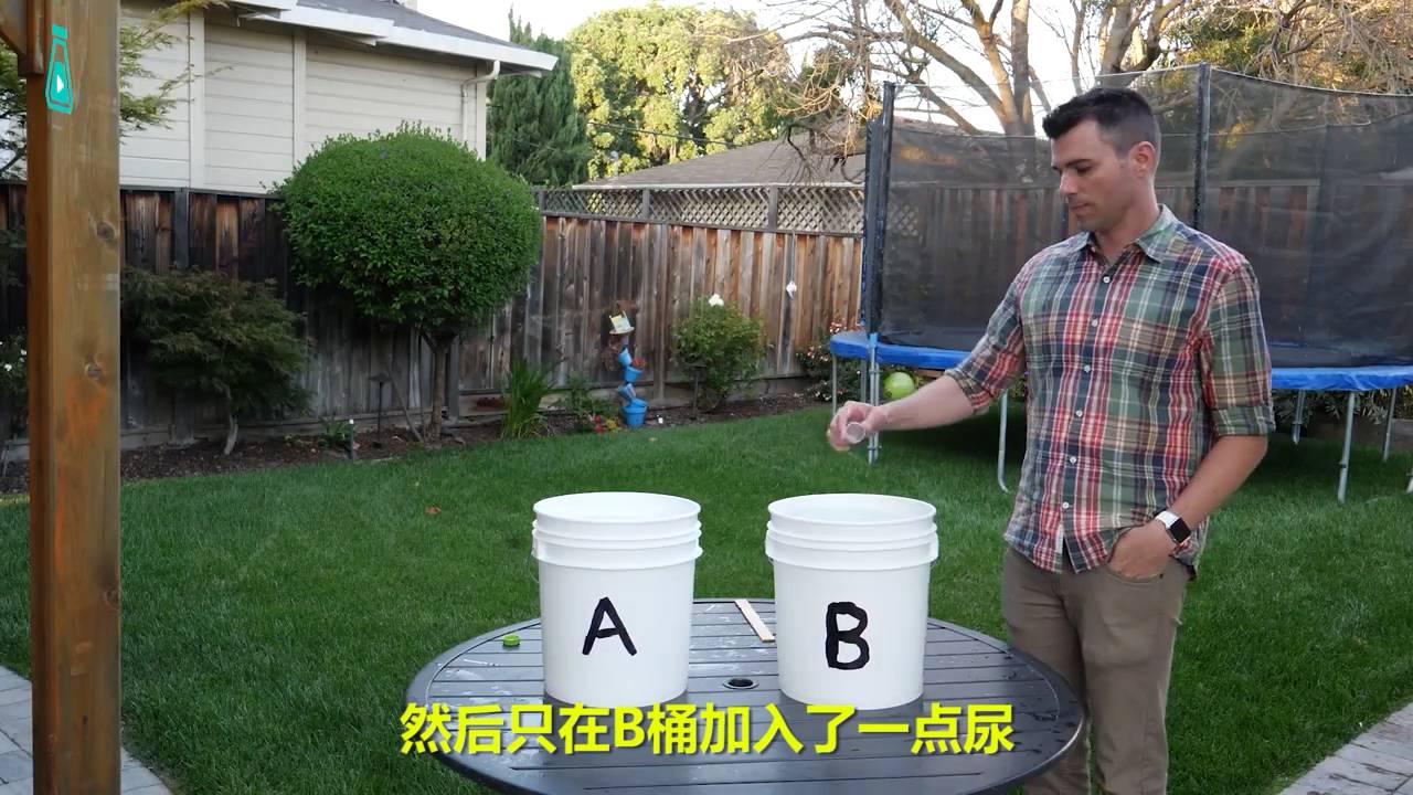 為了驗(yàn)證這一說法,Mark親自測試了一下。他準(zhǔn)備了兩桶各約18升的純水,然后各自加入高于標(biāo)準(zhǔn)濃度4倍的消毒用氯,接著在其中一個(gè)水桶內(nèi)加入了一點(diǎn)尿。